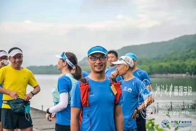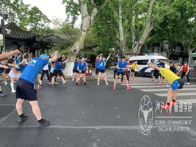 7:10分,浙大MBA沙鹰户外俱乐部的张志懿校友带领大家进行热身。开合跳、速动小碎步、动态拉伸交叉进行,虽然还是清晨,但气温已经来到了将近30度,大家没一会儿便大汗淋漓,但依然热情洋溢。