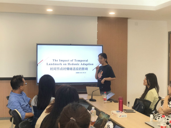 接下来,邱若琳同学分享了自己在学术新星项目中进行的时间节点对享乐适应的影响研究。邱同学首先通过贴近生活的例子介绍了时间节点、享乐适应等概念的含义,并引入注意力原则提出假设:时间节点会导致人们更加关注高层次、全局性的信息,即导致人们失去对事件的聚焦,从而加速享乐适应的过程。接下来,邱同学向大家展示了实验内容与假设检验结果,并总结性的提出了实验过程中的疏忽和有待改进之处,帮助同学们引以为戒,规避可能的错误。