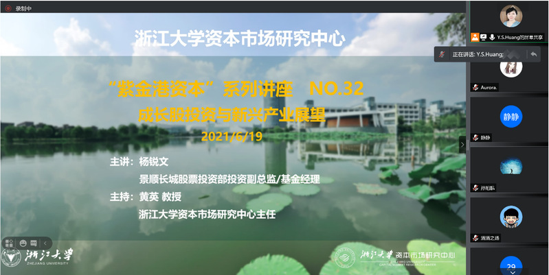 2021年6月19日上午,浙江大学资本市场研究中心“紫金港资本”系列讲座NO.32以线上讲座的形式进行。景顺长城股票投资部执行总监、基金经理杨锐文先生为观众们分享了主题为“成长股投资与新型产业展望”的精彩讲座。此次讲座由浙江大学资本市场研究中心主任黄英教授主持。会计学、工商管理、信息管理与信息系统等专业的国内外高校师生,以及银行、证券、投资、电子商务等行业人士,合计近200名参与了本次讲座。