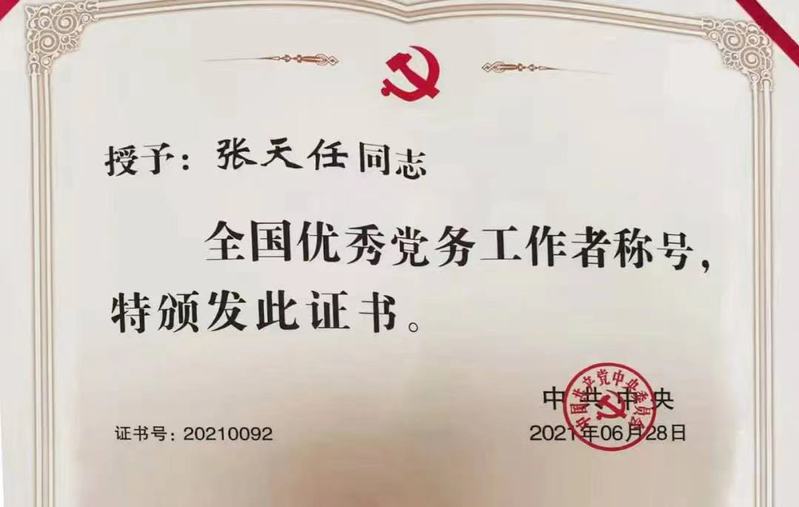“这次能在首都北京参加党的百年华诞庆典,受到党中央的表彰,对我来说,是一次难忘的经历,也是无尚的光荣。作为共产党员,我们将时刻牢记初心使命,艰苦奋斗,创业创新,为人民群众的共同富裕,为中华民族的伟大复兴,为‘两个一百年’的奋斗目标,贡献自己的力量。”张天任表示。