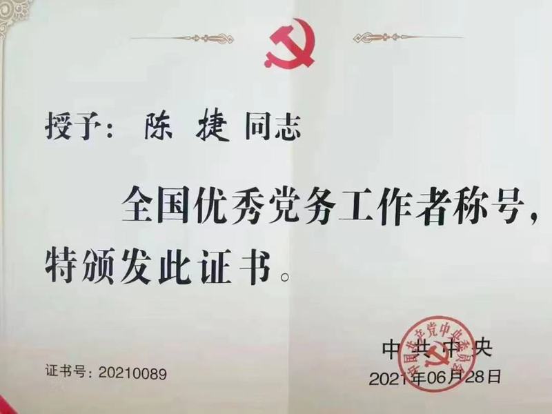 传化集团党委书记、高级副总裁陈捷荣获“全国优秀党务工作者” 。