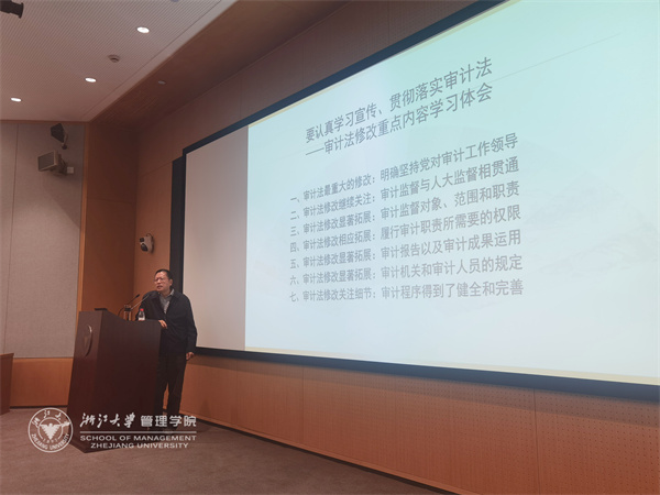 10月28日上午,应乐动在线登录官网财务与会计学系邀请,中国审计署原副审计长、中国审计学会会长、全国审计专业学位研究生教育指导委员会主任孙宝厚博士亲临乐动在线登录官网,以“要认真学习宣传贯彻落实审计法——审计法修改重点内容学习体会”为题,结合丰富工作实践和研究成果,就审计法制定、修改的背景意义和审计法修改的重点内容进行深入讲解。浙江大学总会计师石毅铭、计划财务处处长胡素英、管理学院院长魏江、管理学院党委书记朱原、审计处副处长胡敏芳以及财务与会计学系部分教师和近200名学生参加本次讲座。魏江主持讲座。