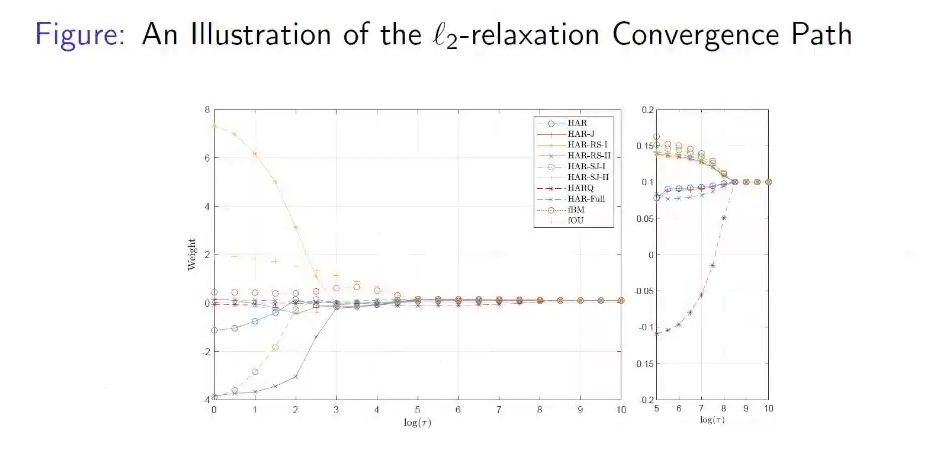 以BTC数据为例,设置T0=round(T/3),h=1 ,使用预测数据的完整样本来训练L2-relaxation算法,根据τ=1,2,…,exp(10)序列估计权重。结果表明,估计的权重变化很大;在几乎所有日期的所有子图中,fBm模型被赋予了比其他模型更大的(绝对值)权重;随着时间的推移,某些权重可能从正变为负(例如HAR-SJ-II模型);在2021年5月19日的大“峰值”日之后,HAR族模型的权重变得比以前波动更少。