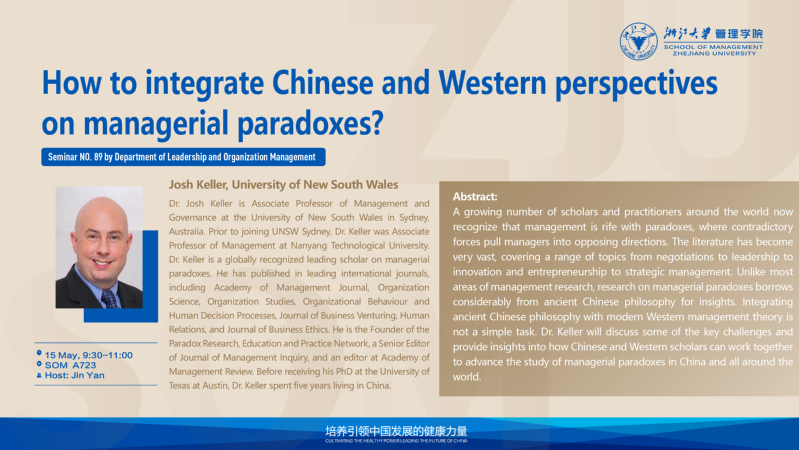 A growing number of scholars and practitioners around the world now recognize that management is rife with paradoxes, where contradictory forces pull managers into opposing directions. The literature has become very vast, covering a range of topics from negotiations to leadership to innovation and entrepreneurship to strategic management. Unlike most areas of management research, research on managerial paradoxes borrows considerably from ancient Chinese philosophy for insights. Integrating ancient Chinese philosophy with modern Western management theory is not a simple task. Dr. Keller will discuss some of the key challenges and provide insights into how Chinese and Western scholars can work together to advance the study of managerial paradoxes in China and all around the world.