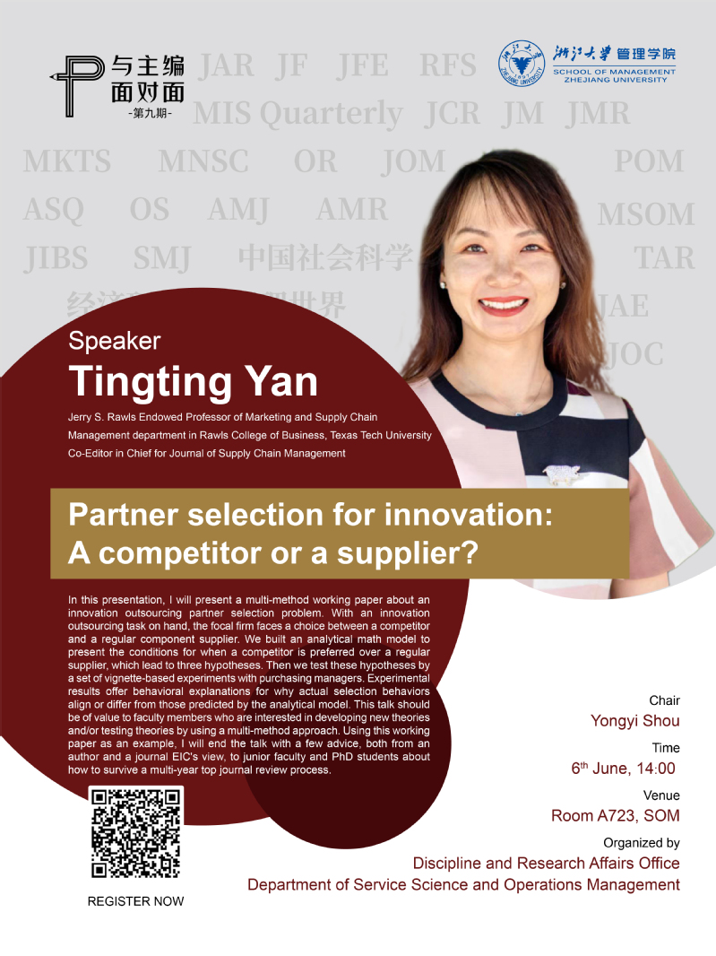 In this presentation, I will present a multi-method working paper about an innovation outsourcing partner selection problem. With an innovation outsourcing task on hand, the focal firm faces a choice between a competitor and a regular component supplier. We built an analytical math model to present the conditions for when a competitor is preferred over a regular supplier, which lead to three hypotheses. Then we test these hypotheses by a set of vignette-based experiments with purchasing managers. Experimental results offer behavioral explanations for why actual selection behaviors align or differ from those predicted by the analytical model. This talk should be of value to faculty members who are interested in developing new theories and/or testing theories by using a multi-method approach. Using this working paper as an example, I will end the talk with a few advice, both from an author and a journal EIC's view, to junior faculty and PhD students about how to survive a multi-year top journal review process.