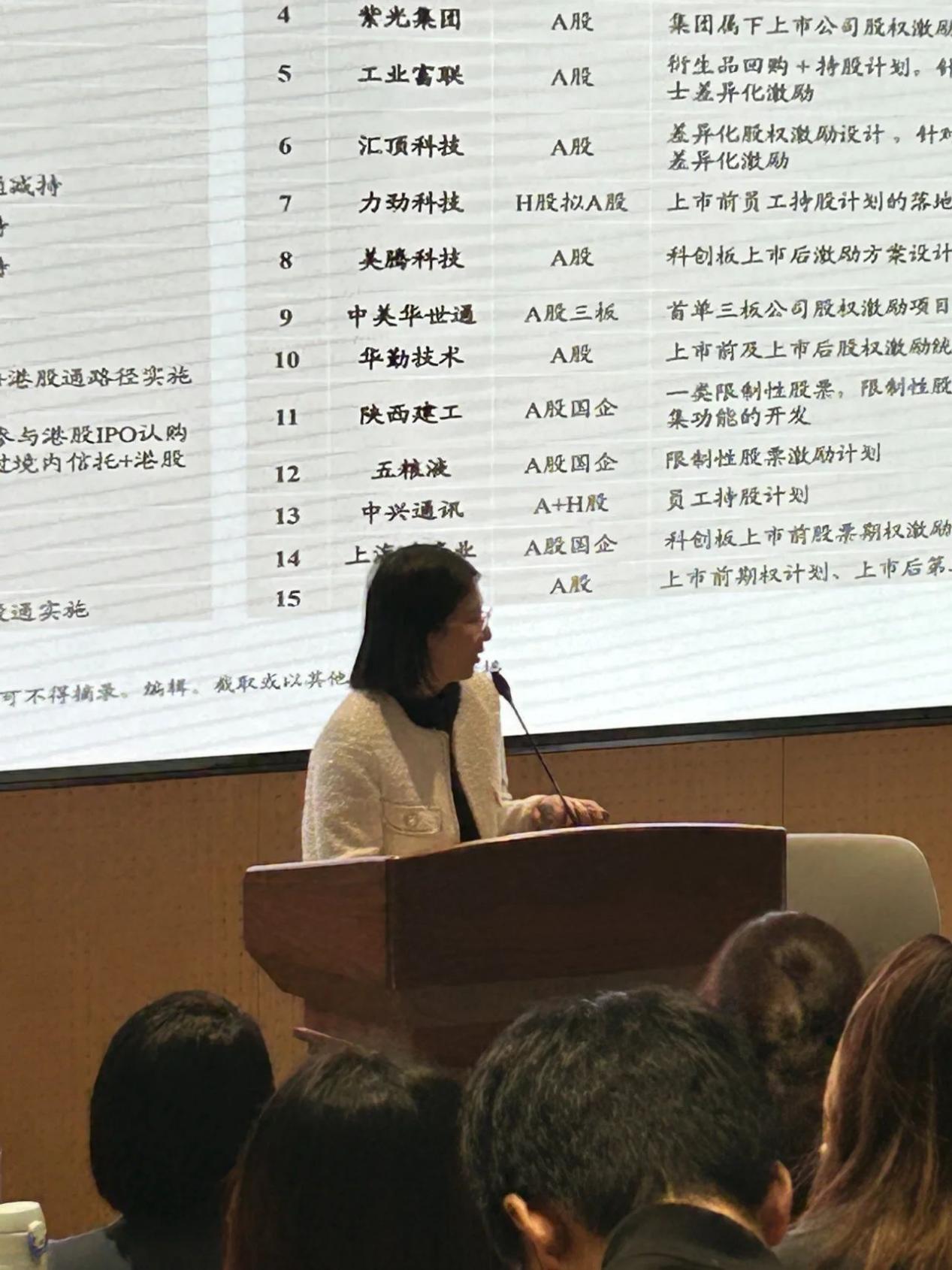 最后,陈方园女士分享了五则中金财富实施股权激励的标杆案例。讲座中,沈琼女士和陈方园女士凭借其在股权激励领域多年的实战经验,为现场观众提供了解股权激励的实用指南。在互动环节,同学们踊跃提问,回答了关于股权激励与当前热点ESG相关的问题,对于股权激励的实操问题进行了解答。同学们纷纷表示此次讲座收获颇丰,对股权激励有了更深的理解。讲座在大家热烈的掌声中圆满结束。