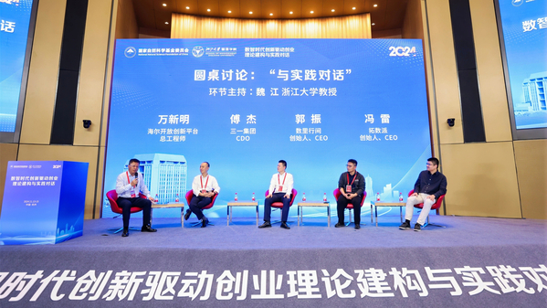 为增强与实践的对话,会议邀请了海尔、三一、美云智数等企业代表就数智时代创新创业的探索与思考、数智化转型以及创业机会挖掘画布的意义与实践等话题进行报告,显现了项目理论成果的实践影响。随后,上述企业代表与数里行间、拓数派等企业代表进行圆桌讨论,进一步丰富了对于数智时代创新驱动创业理论和实践如何融合互促的认识。