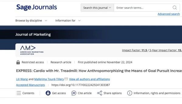 该研究发表于Journal of Marketing(UTD24之一、FT50之一),题为Cardio with Mr. Treadmill: How Anthropomorphizing the Means of Goal Pursuit Increases Motivation。本期【科研】,我们一起来看看这项高水平研究。