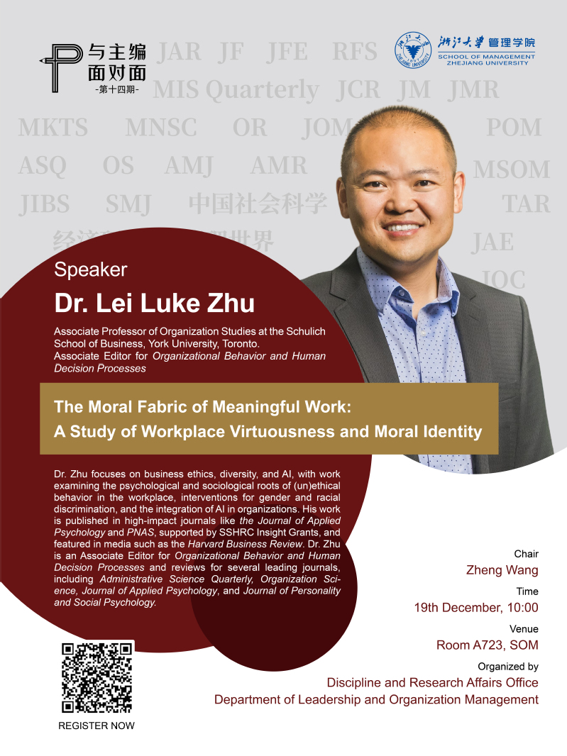 讲座标题(Title): The Moral Fabric of Meaningful Work: A Study of Workplace Virtuousness and Moral Identity