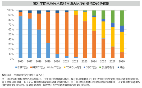 光伏电池的技术路线之争还在继续。据中国光伏行业协会的研究预测,无论是TOPCon、异质结和BC三大晶硅电池路线,还是以MWT为代表的金属线路电池和以钙钛矿为代表的新型薄膜电池,都有潜力成为新的主流技术(见图2)。