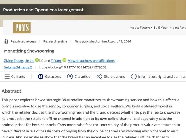 研究中,他们揭示了全渠道背景下的线上品牌使用线下零售商展厅服务的动机,探索了线下零售商的“破局路径”,并指出线下零售与线上品牌之间的竞争并非零和博弈,双方可以实现共赢。