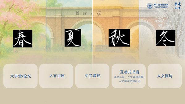 贯穿春夏秋冬四个季节,从一年四期的大讲堂,到精彩纷呈的小型人文讲座,从灵感迸发的读书分享会,到一丝不苟的学分课程,“求是人文”既有互动式书斋的探讨,亦有沉浸式的观摩学习。