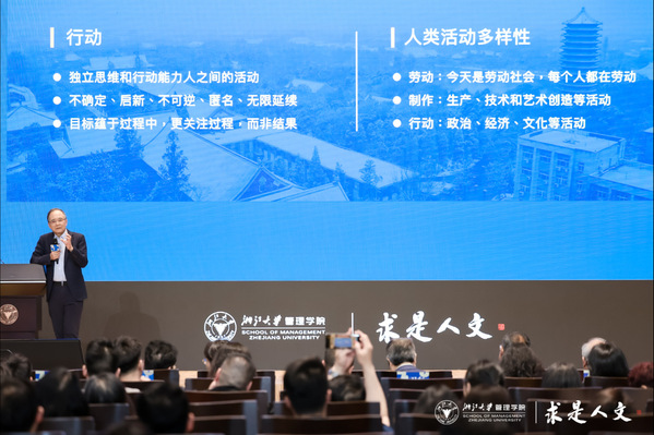 浙江大学原校长、北京大学原校长林建华教授作为“求是人文”系列总顾问,分享了自己在工作和学习过程中对人文知识的感悟。他说,对于企业管理者和立志成为企业家的人来说,学习人文知识至关重要,这有助于理解所从事事业的底层逻辑。例如,在大学教育场景中,各类活动涵盖了汉娜·阿伦特提出的“劳动、制作和行动”三类人类根本性活动。其中,教学属于行动,具有不确定性、匿名性等特点,而科研则属于制作,成果易于衡量且能带来即时回报,教育、大学和学术发展属于行动,多重属性的交织引发了深刻的实践困惑。在这种背景下,如何避免劳动的奴性、教育和学术发展的功利性?管理者需要学习人文知识,才能更好地理解教师行为,优化教育管理。
