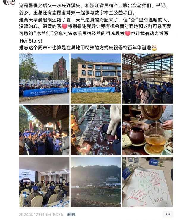 溪头村的申报工作结束后,徐雅莹与村子的缘分并没有结束。溪头村入选世界“最佳旅游乡村”后,来旅游的人数持续增加。旺季时,溪头村原有的27家民宿(农家乐)已经满足不了需求。村民们发展民宿的热情很高,加上原有的民宿主自我要求也高了,迫切希望提升民宿服务技能。于是,驻扎在溪头村的“浙江省文化特派员”吴茂英看到了村民提升旅游技能的愿望,于是联络浙江省旅游民宿产业联合会,将第“数字木兰”239期活动送进了溪头村。