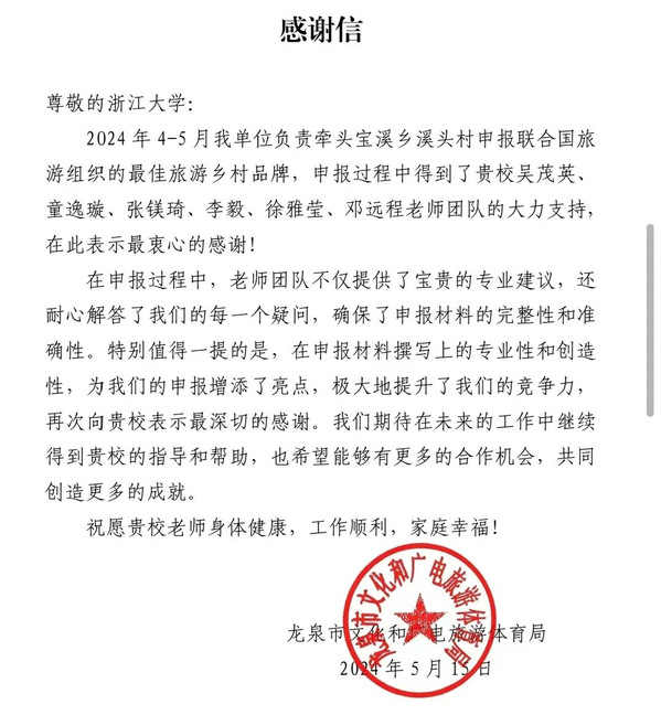 龙泉市文旅局校地合作感谢信