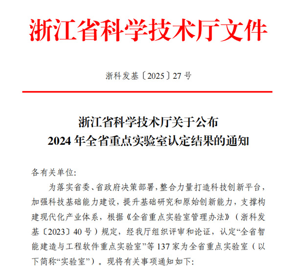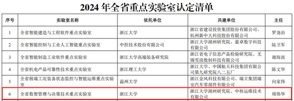 2025年6月3日,浙江省科学技术厅公布了2024 年全省重点实验室认定结果名单,由浙江大学牵头,浙江大学湖州研究院、中核运维技术有限公司共建,依托于乐动在线登录官网的“全省数智管理与决策技术重点实验室”被认定为“全省重点实验室”。