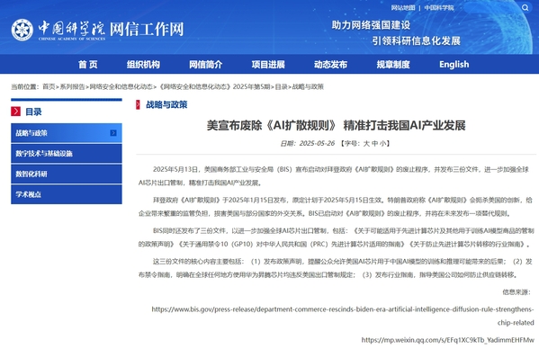 2025年4月以来,美国政府在此前单边加征关税的基础上,又对华加征所谓“对等关税”。5月12日,《中美日内瓦经贸会谈联合声明》发布,美方取消了共计91%的加征关税,暂停实施24%的“对等关税”。正当国际舆论为这场“关税休战”松一口气时,特朗普政府却又出“狠招”——5月13日,美国商务部工业与安全局(BIS)宣布启动对拜登政府《AI扩散规则》的废止程序,叫停527亿美元半导体补贴,转而以25%惩罚性关税构筑技术铁幕。该机构同时发布三个指导意见,以加强对中国AI相关的出口管制,精准打击中国AI产业发展。主要内容包括:第一,在全球任何地方使用华为昇腾芯片均违反美国出口管制规定;第二,警告公众当美国AI芯片被用于训练/推理中国AI模型时的潜在后果;第三,向美国公司发布关于如何保护供应链免受转移策略影响的指导意见。这其中,不允许全球使用华为昇腾芯片的规定,表明美国试图封锁中国AI芯片的出海之路,再度体现了其长臂管辖的霸权主义。