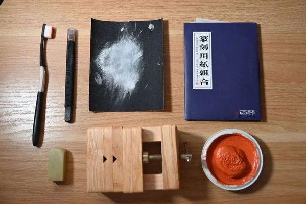 制作刻章,要先在纸上设计出印稿,字体、布局皆有讲究;而后,将印稿印到石章的刻面上,这称作“印稿上石”;再将石章固定在印床上,印面朝上;接着,用刻刀在石头上雕刻,一笔一划,需轻重得当、大小合适,若是不慎刻歪了,就要用砂纸把印面磨掉,从头开始。印面残留的石屑,用刷子仔细冲洗干净,然后打上印泥,让印面与印泥均匀接触,一枚印章就已经完成了。